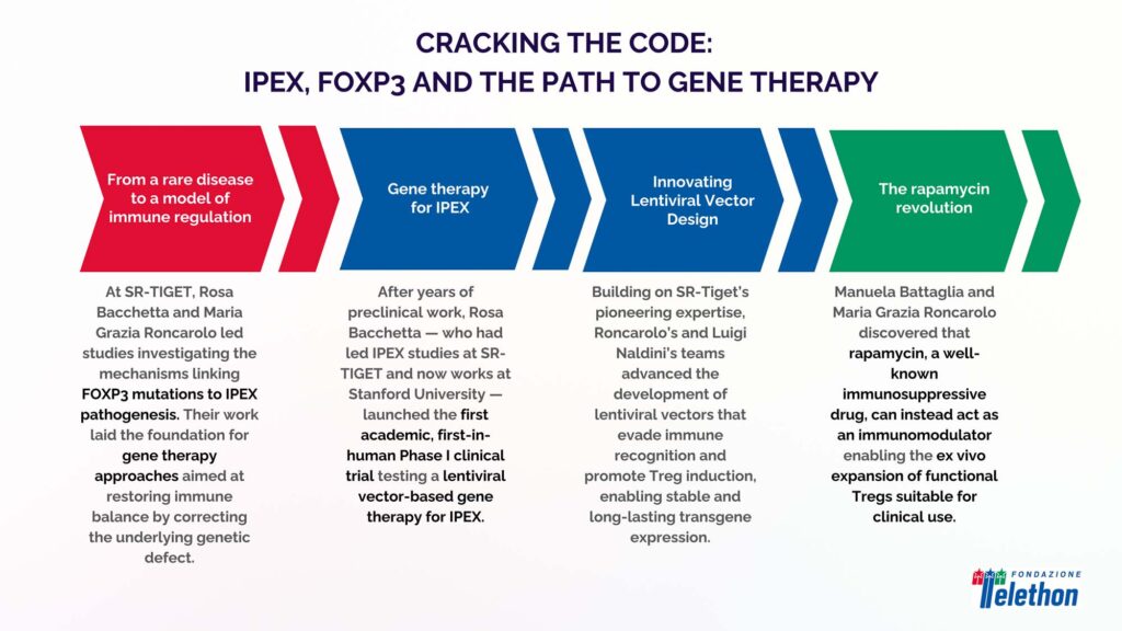 At SR-TIGET, Rosa Bacchetta and Maria Grazia Roncarolo spearheaded studies investigating the mechanisms linking FOXP3 mutations to IPEX pathogenesis. Their work laid the foundation for gene therapy approaches designed to restore immune balance by correcting the underlying genetic defect.