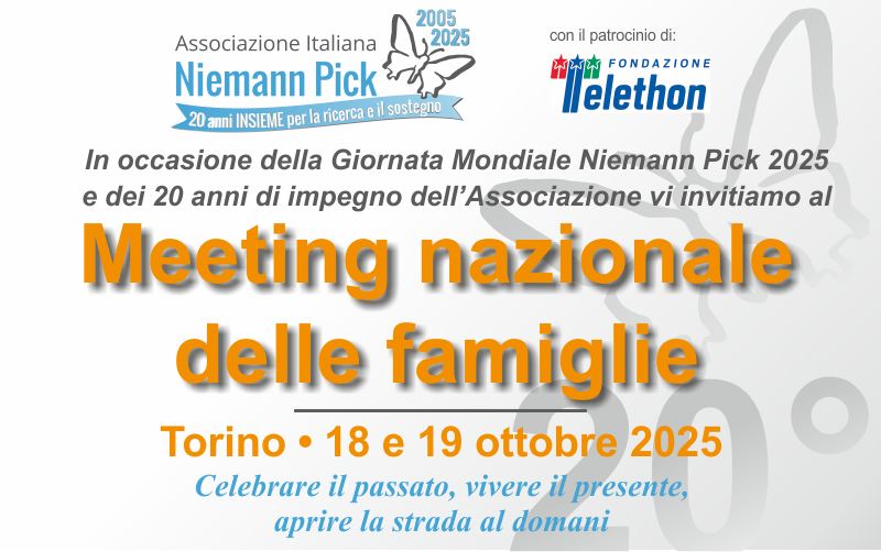 In questa occasione, l’Associazione Italiana Niemann Pick organizza il Meeting nazionale delle famiglie dal titolo: “Celebrare il passato, vivere il presente, aprire la strada al domani”.