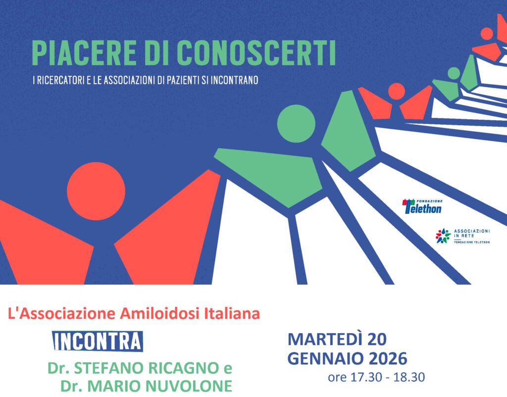 Martedì 20 gennaio 2026, dalle ore 17.30 alle 18.30, i ricercatori Stefano Ricagno e Mario Nuvolone incontreranno online l'Associazione Amiloidosi Italiana e faranno il punto sull’andamento del loro studio finanziato da Fondazione Telethon:
